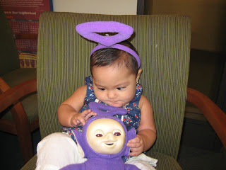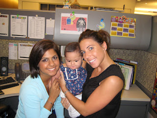 Yesterday I took Soleil to work with me. Since my new Boss is on vacation, and it was summer Friday (we get to leave at 1pm) I thought it would be an opportunity to bring her in since my co=workers begged me to. I couldn't bring them both because there is no elevator in my subway station and I cant manage to carry my double stroller plus the two by myself. So I placed her in my carry on and off we went.